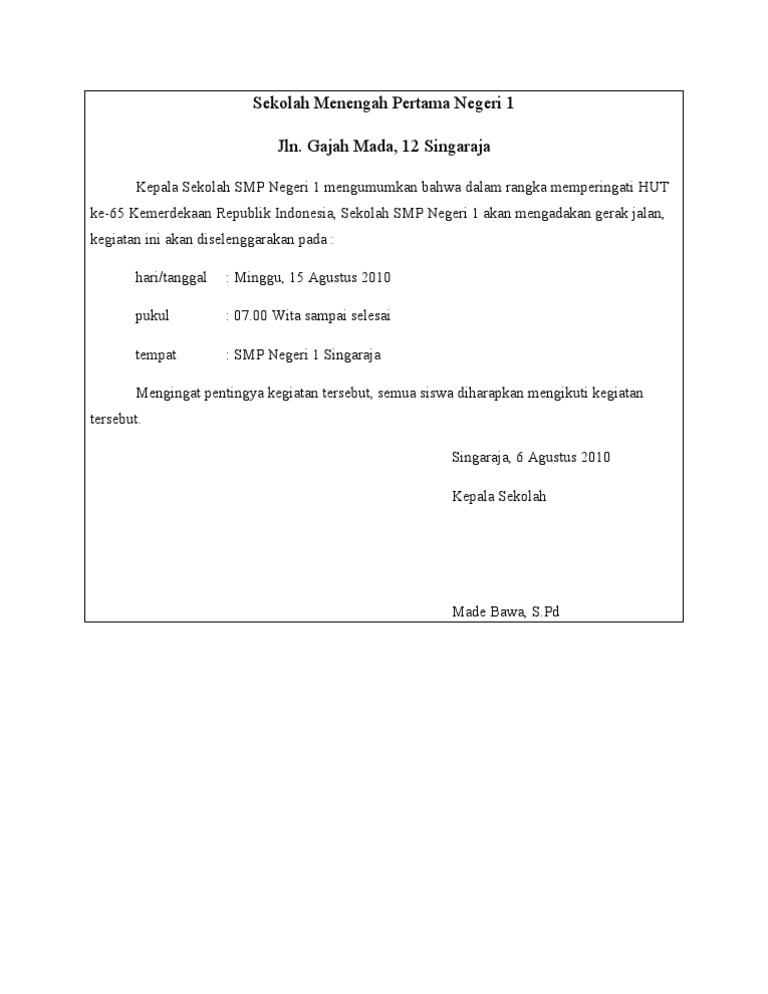 Latar belakang proposal biasanya terdiri dari 3 bagian, yakni bagian pendahuluan, isi dan penutup yang disusun dengan pola umum ke khusus. Apr 17, 2021 · contoh format pengumuman kelulusan sd mi smp mts sma ma smk tahun 2021 format doc atau word wahana informasi kepala sekolah, guru dan siswa sd mi, smp, mts, sma, smk, ma ☰ menu This grammar topic is easier than the last one. Hal ini karena isi dari pengumuman tidak akan berguna bagi kita apabila pengumuman tersebut ditujukan kepada orang lain. Poin penting pertama yang harus sahabat ketahui didalam contoh teks announcement adalah kepada siapa pengumuman tersebut ditujukan.